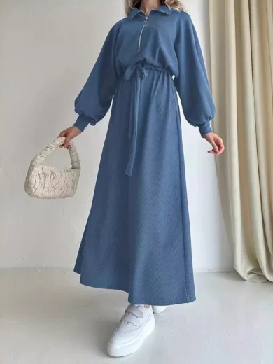 Fashion Muslim Dress New Solid Color Zipper Belt Fashion Lapel Elegant Dress Muslim Women Modest Long Dresses