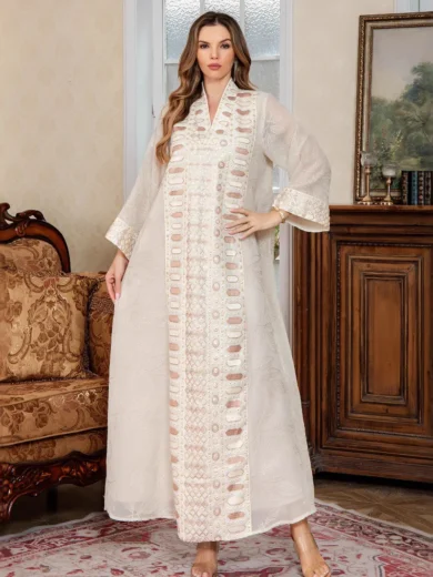 SMT141 Elegant Muslim Dress Embroidery Mesh Sleeves Abaya Middle East Clothes Women Robe Islamic Fashion V-Neck Gown Evening Party Wear