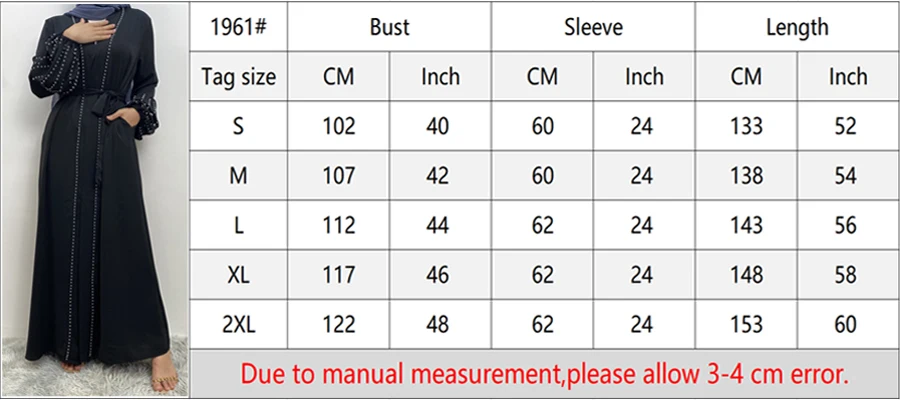 2XL: Bust 122 cm,Sleeve 62 cm,Length 153 cm