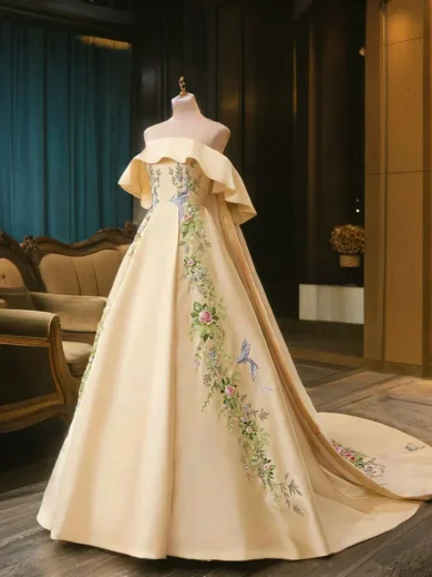 Be the first to review “Luxury Appliques Evening Dresses Yellow Srapless Chapel Train Sleeveless Draped Formal Occasion Elegant Women Princess Dress”
