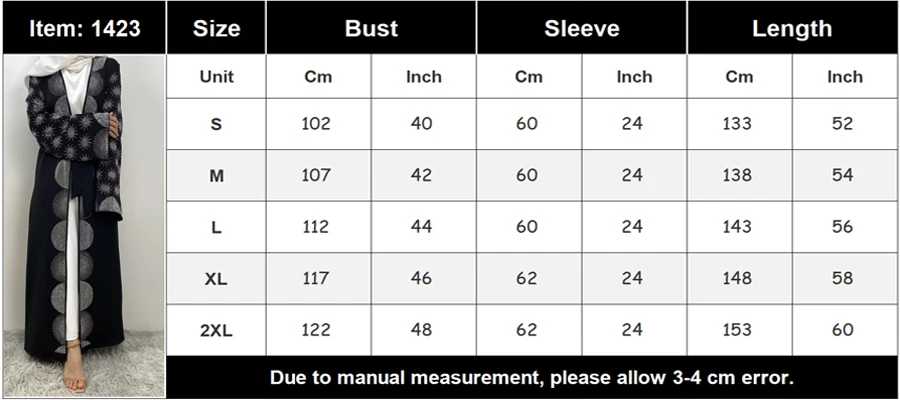 S: Bust 102 cm,Sleeve 60 cm,Length 133 cm