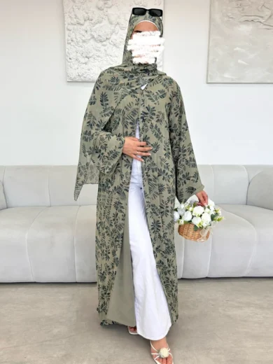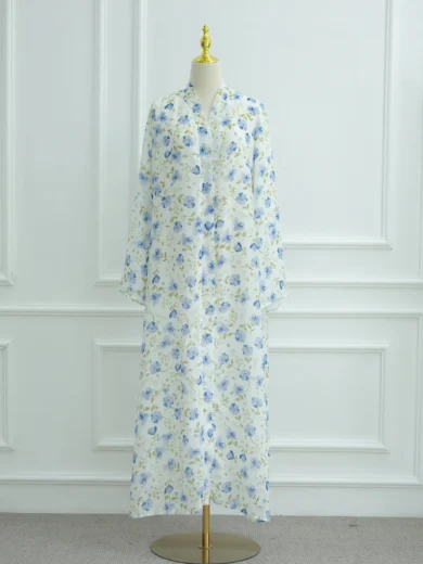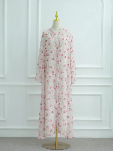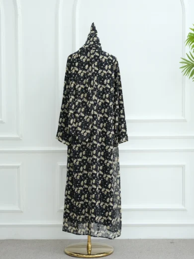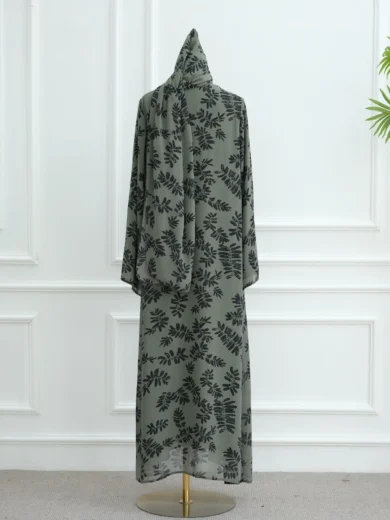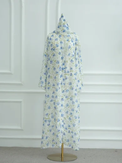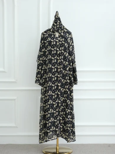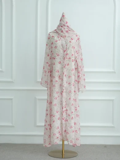 LR1067 Summer Ramadan Chiffon Modest Abaya Women Muslim Dress Two Pieces Set Front Open Printed Kimono Abaya With Matching Hijab Scarf