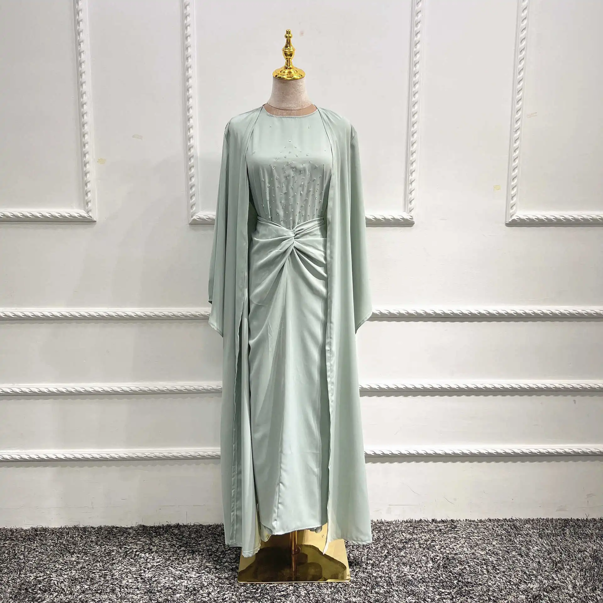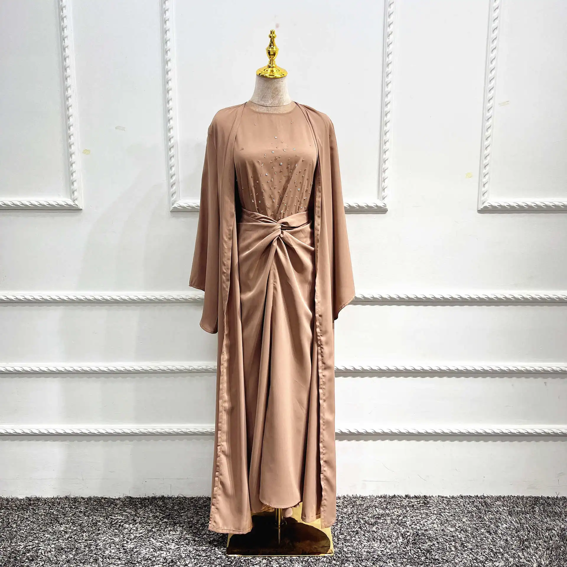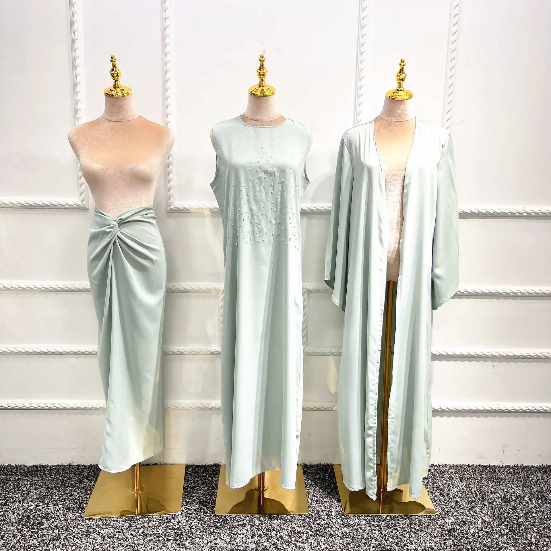 Turkish Solid Color Fashion Beaded Three Piece Set Muslim Women Outfit Abaya Jilbab Hijab Modest Clothing